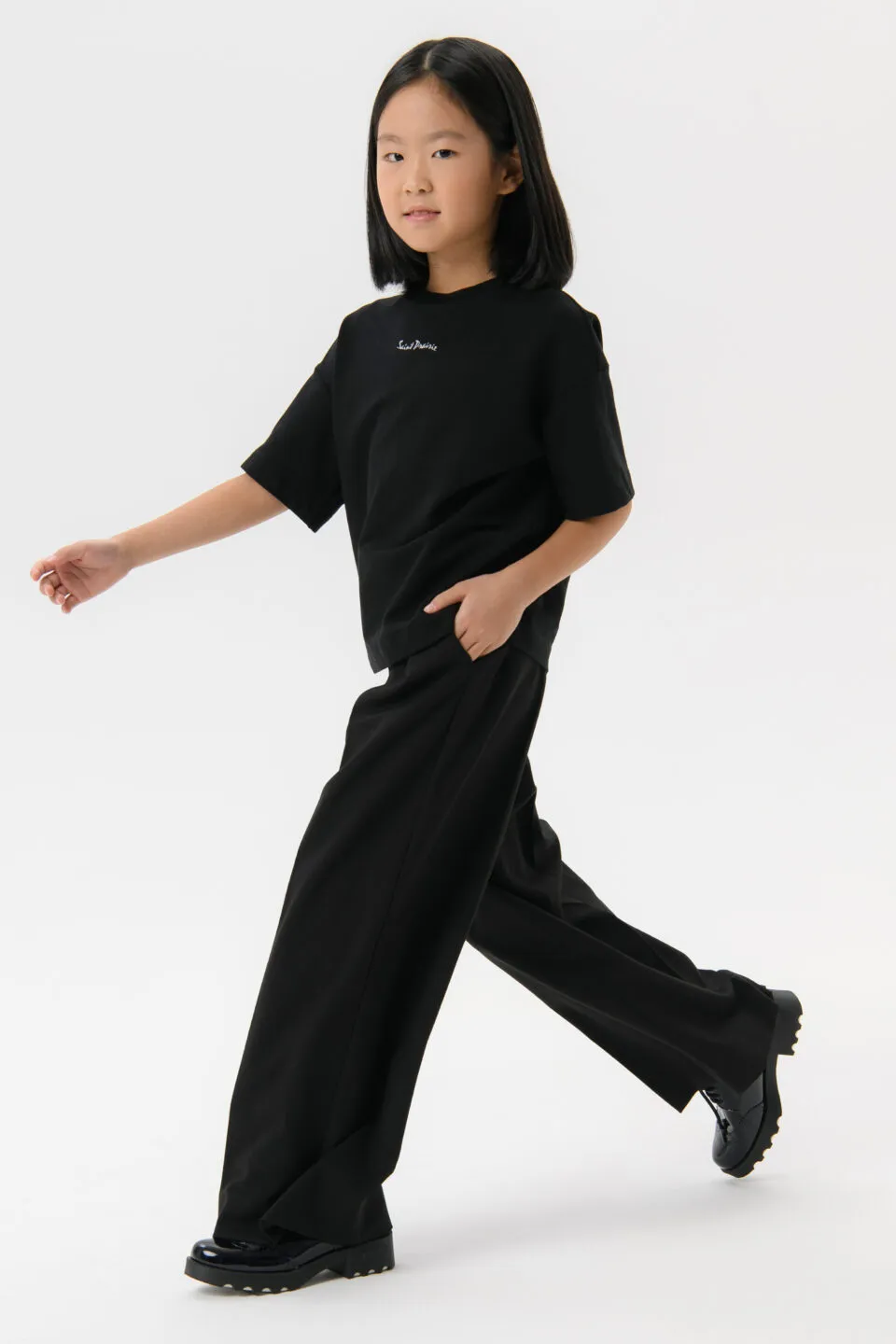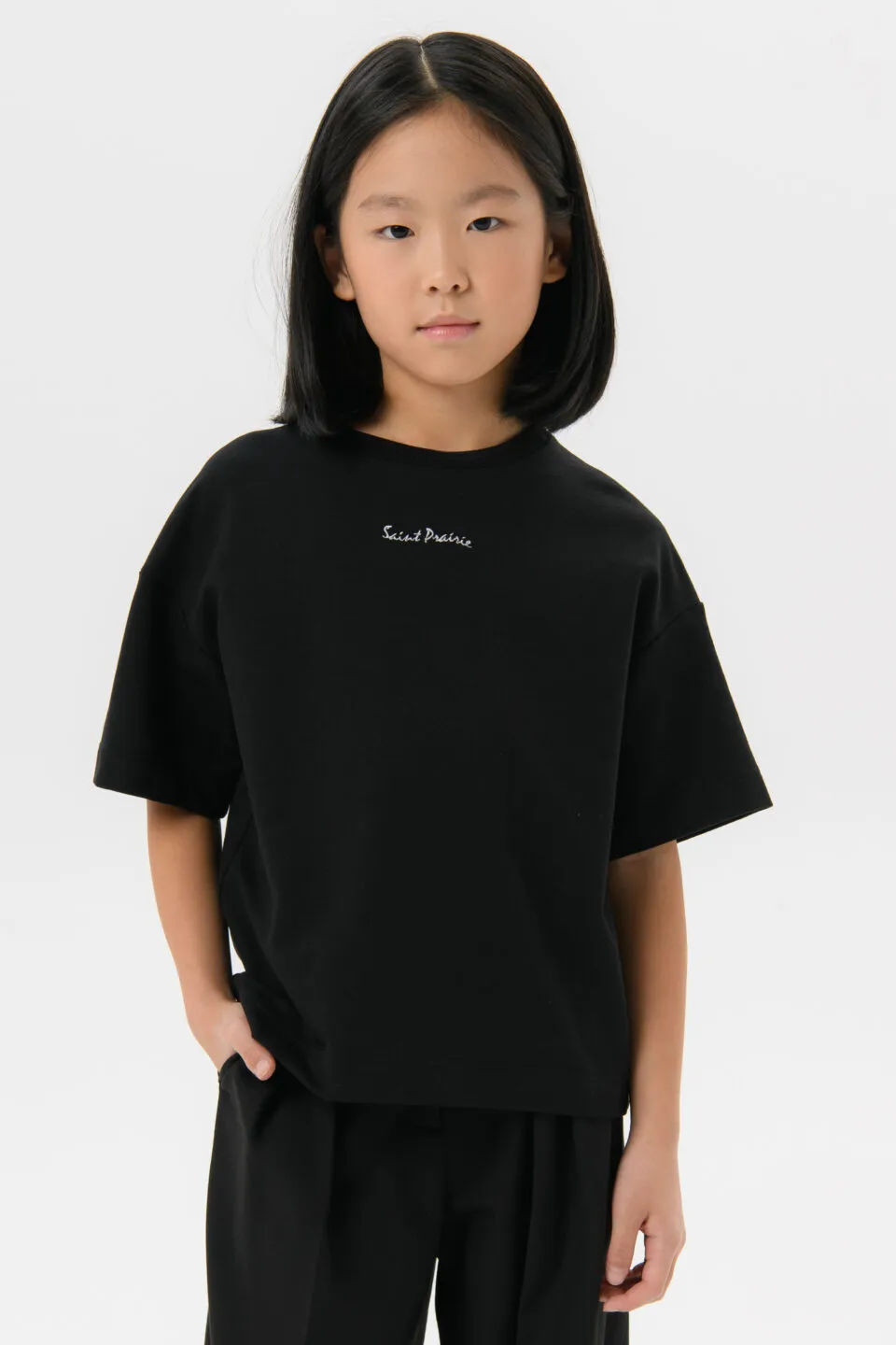 Футболка из трикотажного полотна, свободного силуэта, со спущенным плечом. Круглая горловина с узкой эластичной планкой. В верхней части переда вышивка — логотип. Рукава втачные. В боковом шве светоотражающий кант.