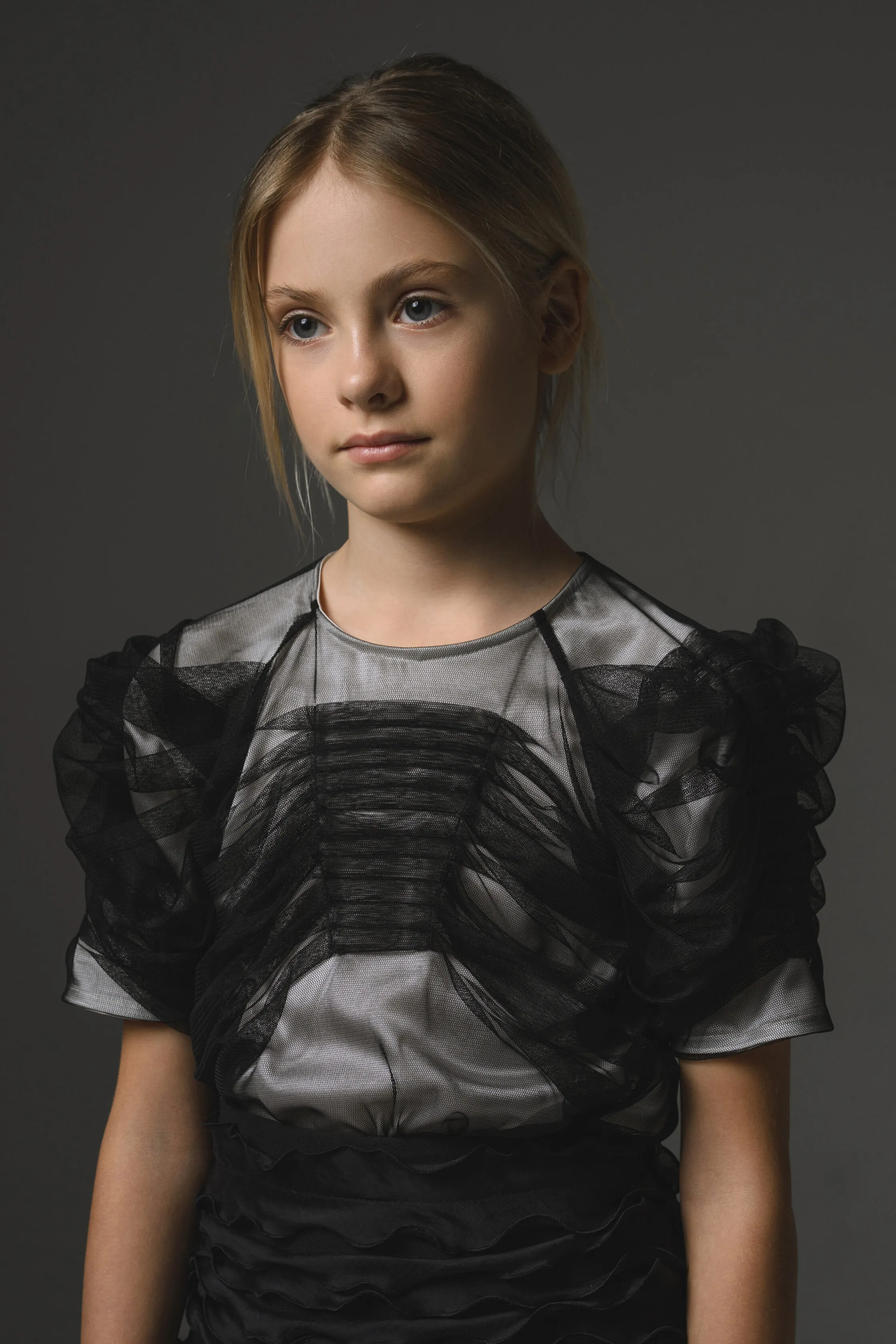 Нарядная блузка прямого силуэта, рукава реглан. Нижняя блузка из натуральной шелковой ткани молочного цвета. Верхняя блузка из черной сетки, перед и рукава с заложенными односторонними складками, создающими объем. Блузка без воротника, застежка «капелька» на навесную петлю и пуговицу расположена в верхней части среднего шва спинки.