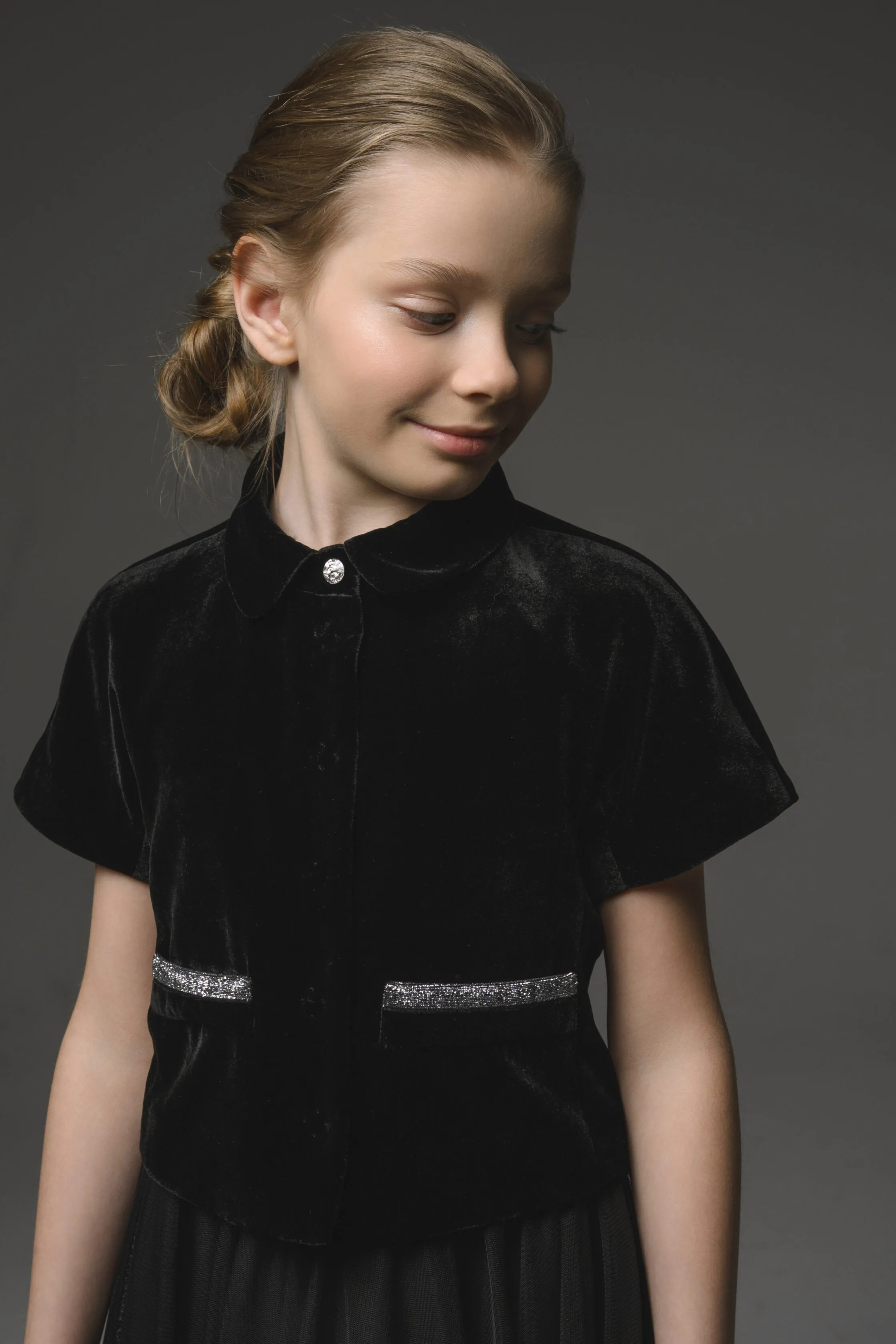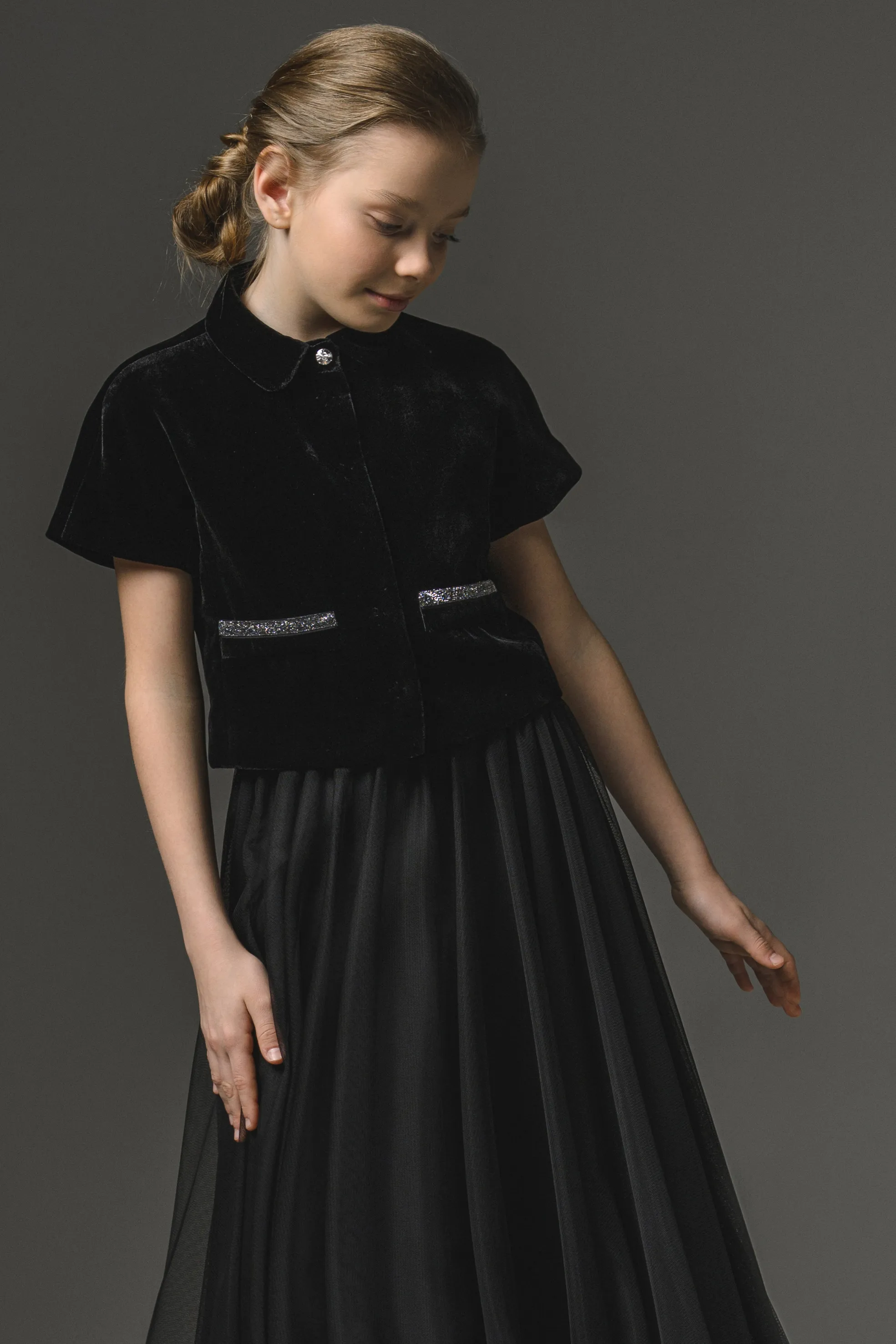 Жакет прямого силуэта, из бархатной ткани, на подкладке, длиной выше линии бедер. На полочках накладные листочки с отделкой бархатной тесьмой с люрексом. Воротник отложной на стойке. Застежка по центру переда на потайные кнопки. На стойке пришита отделочная круглая страза.