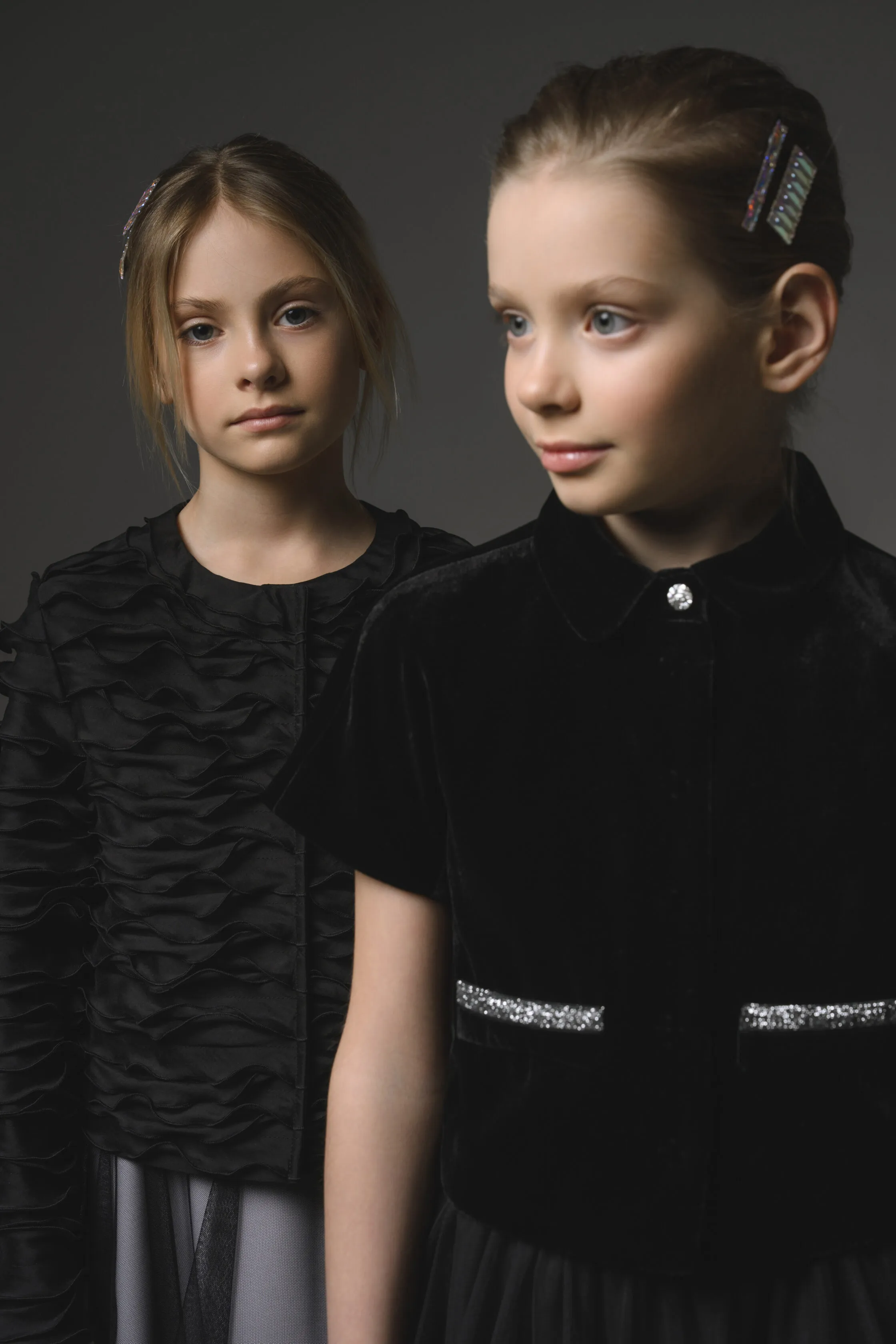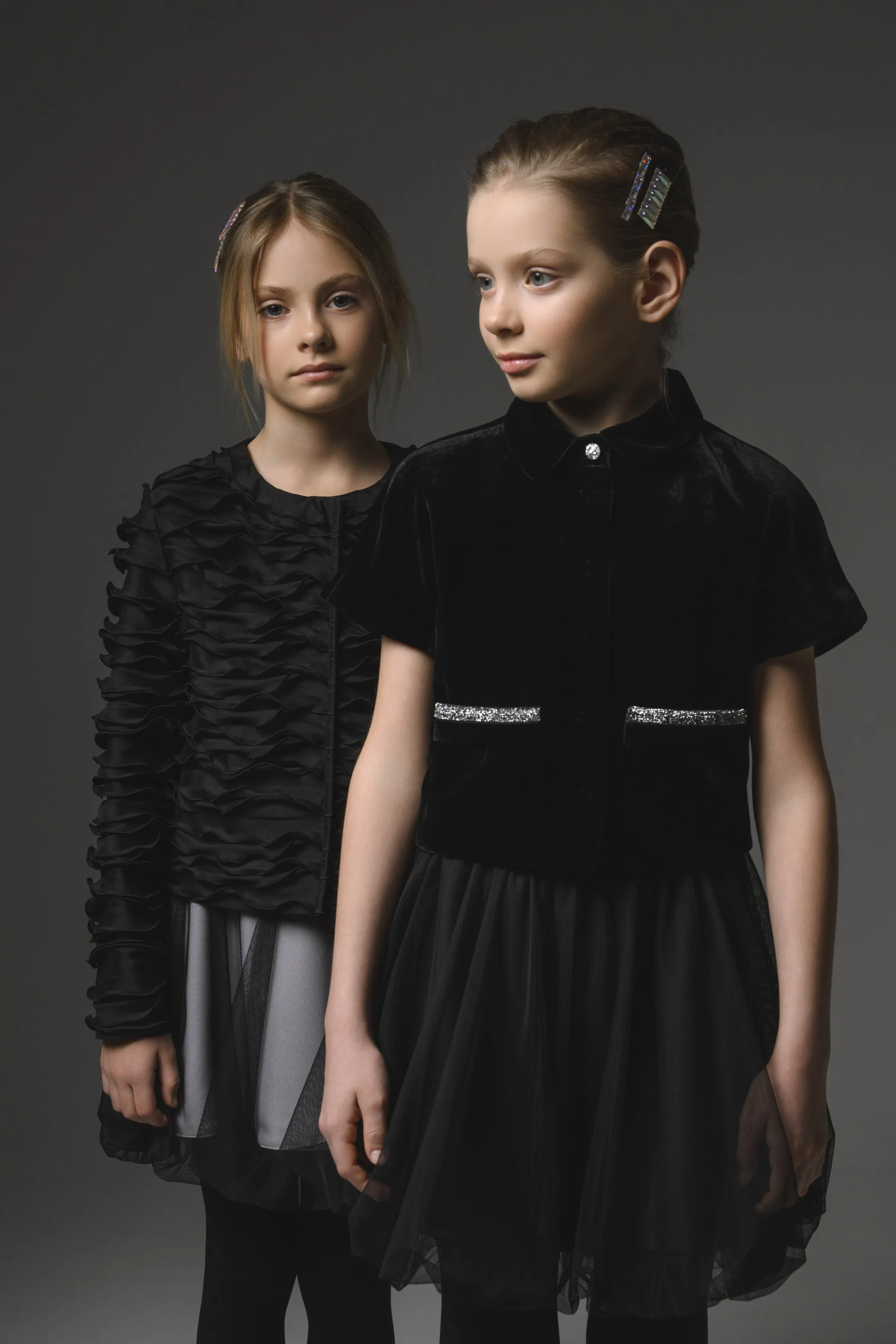 Нарядное платье из атласной ткани приталенного силуэта, расклешенное к низу, на подкладке. Без рукавов, без воротника, круглый вырез горловины, застежка на потайную молнию по центру спинки. От талии расходятся мягкие фигурные фалды. Клинья юбки из контрастной креповой ткани заложены складками гофре.