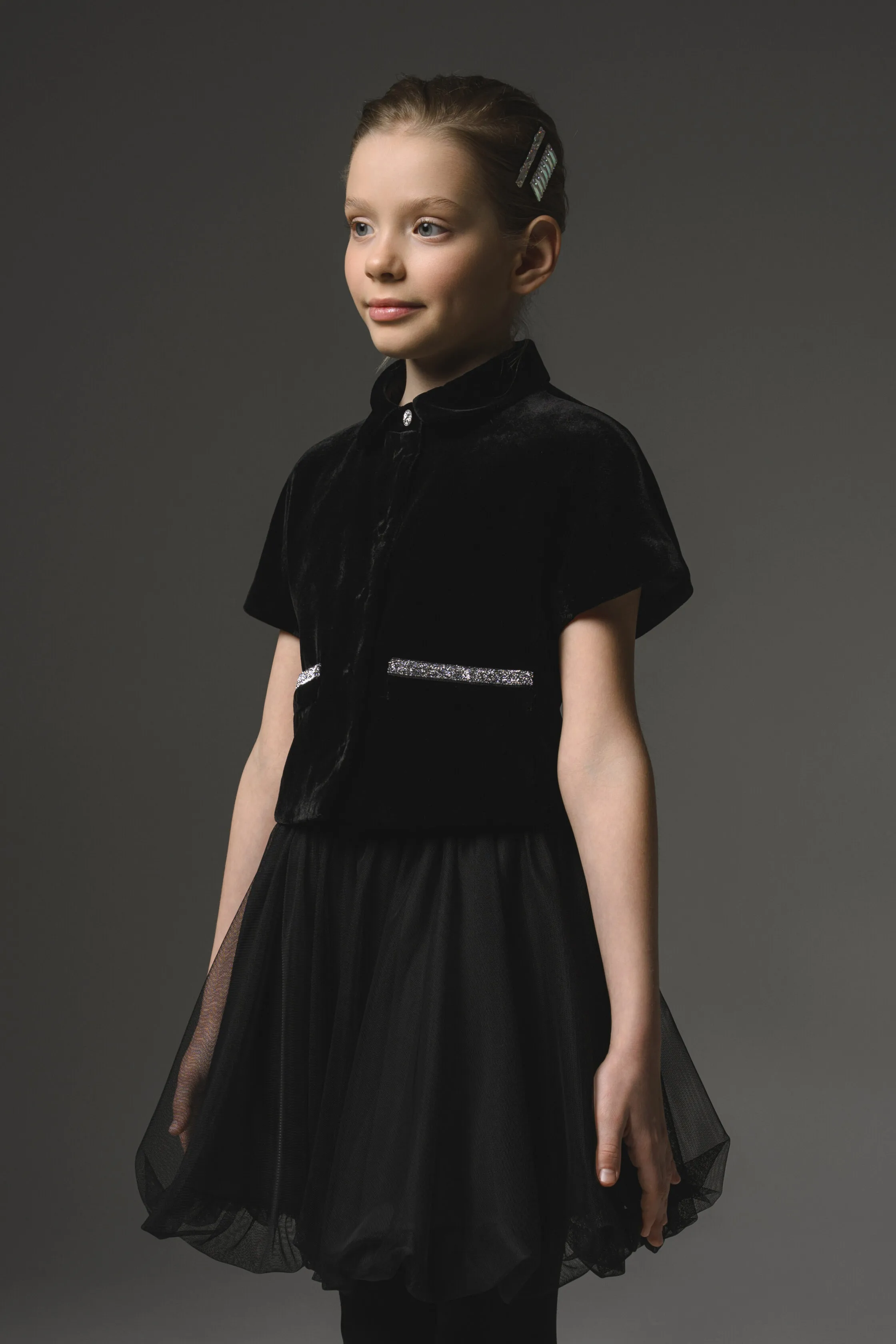 Нарядное платье из атласной ткани, на подкладке, приталенное, без воротника, круглый вырез горловины. Застежка расположена по центру спинки на потайную молнию, вдоль которой пришиты отделочные пуговицы контрастного цвета. Рукава короткие, фигурной формы, объемные в верхней части внутренняя часть рукавов с отделкой контрастной тканью. Юбка в форме колокола. Внизу левого бокового шва пришита отделочная страза прямоугольной формы. Ширина платья по талии регулируется бантом, завязывающимся на спинке.