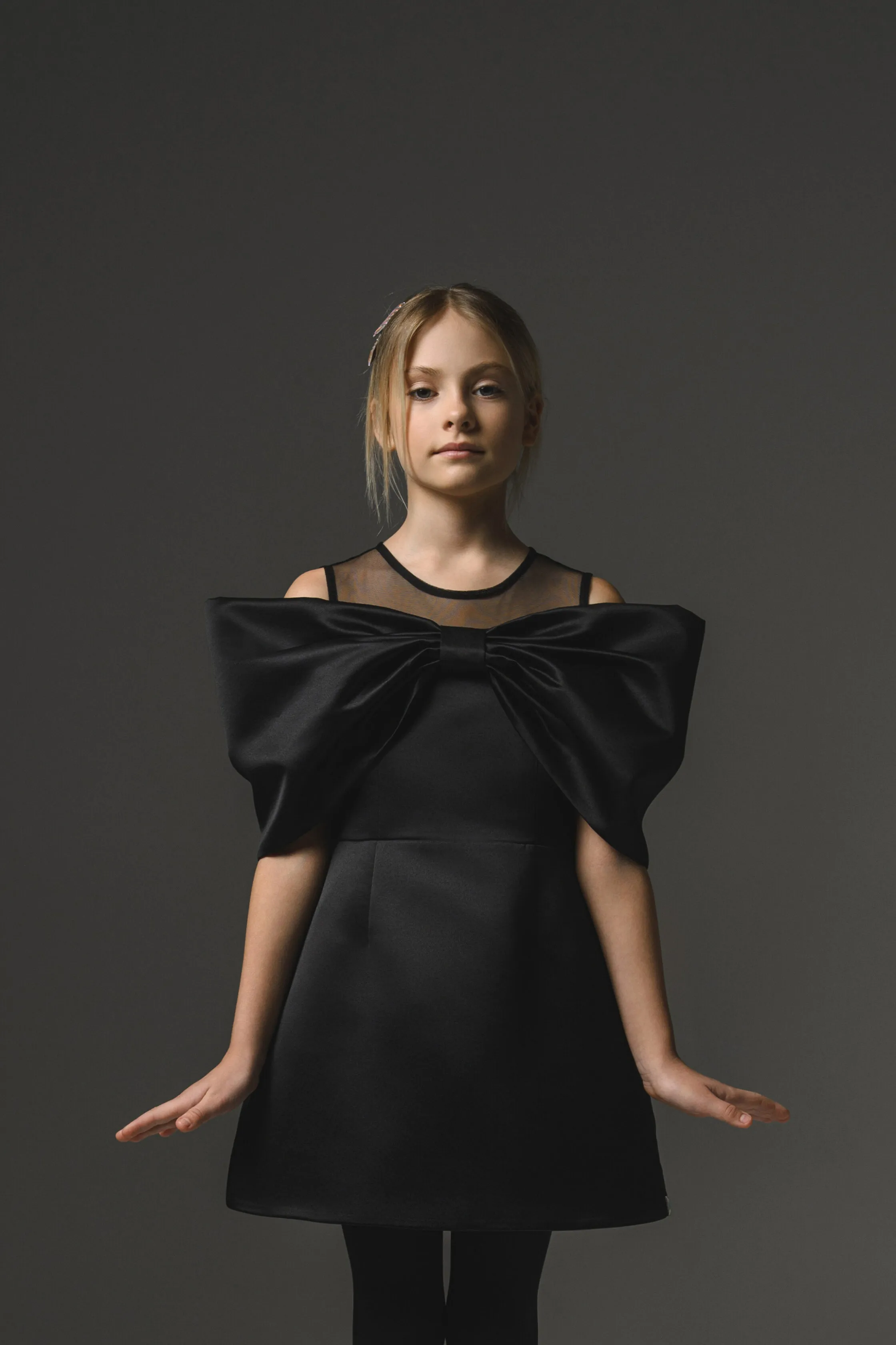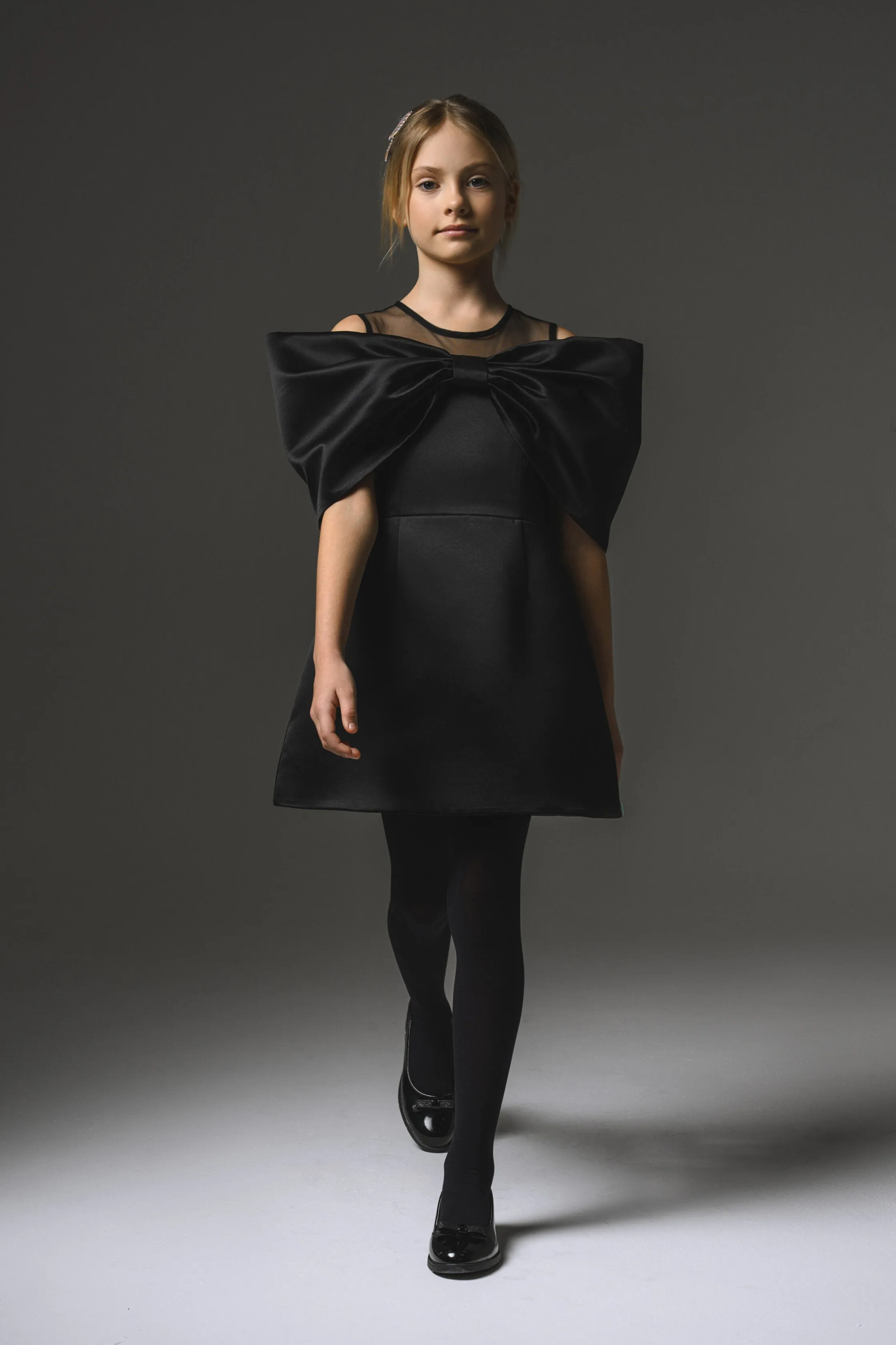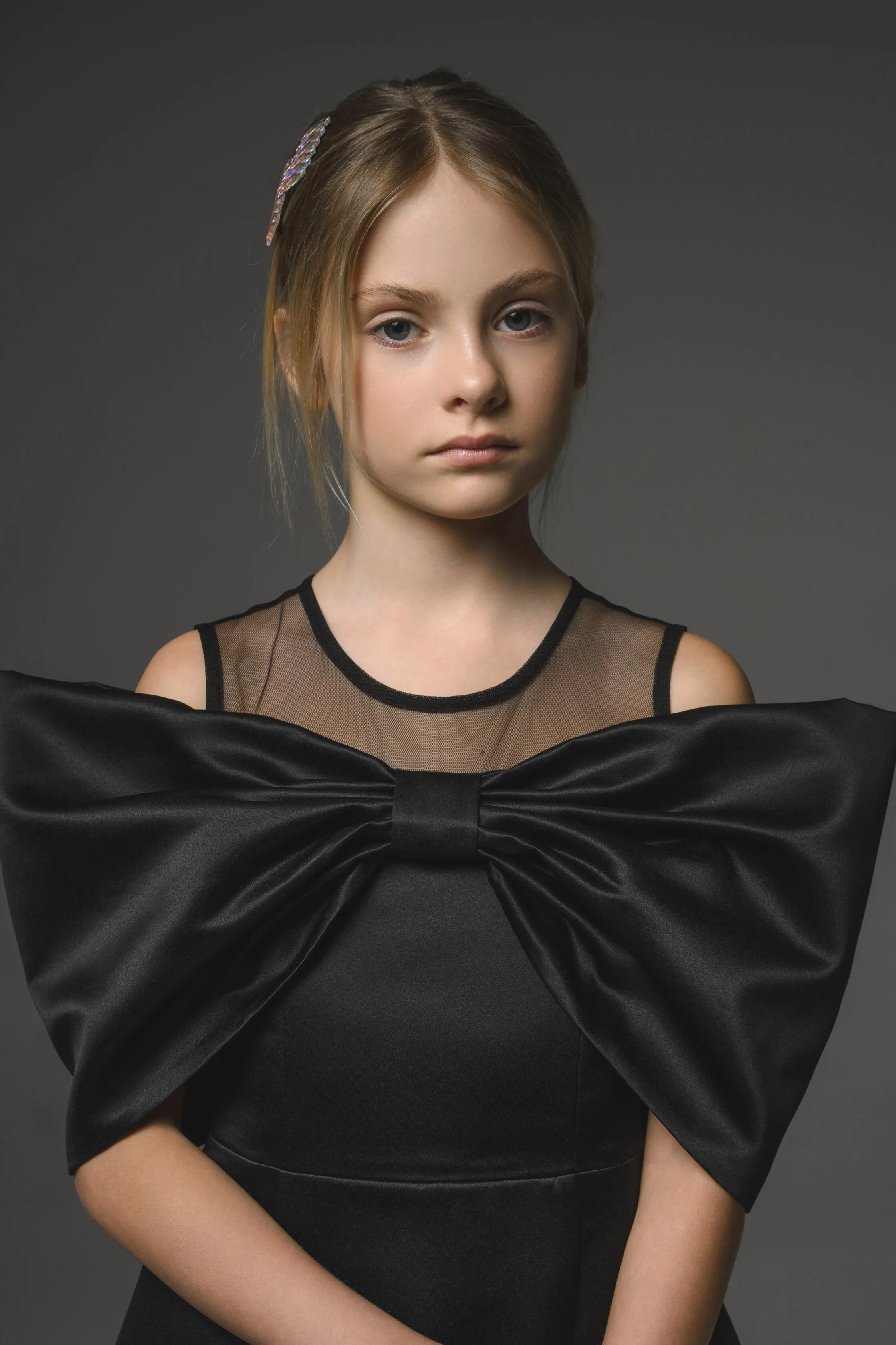 Нарядное платье из атласной ткани, прилегающего силуэта, на подкладке. Верхняя часть лифа выполнена из трикотажной сетки. Платье без воротника и рукавов, круглый вырез горловины застегивается на спинке на навесную петлю и пуговицу и потайную молнию. Верх платья оформлен крупным бантом. Юбка в форме колокола. Внизу левого бокового шва пришита отделочная страза прямоугольной формы.
