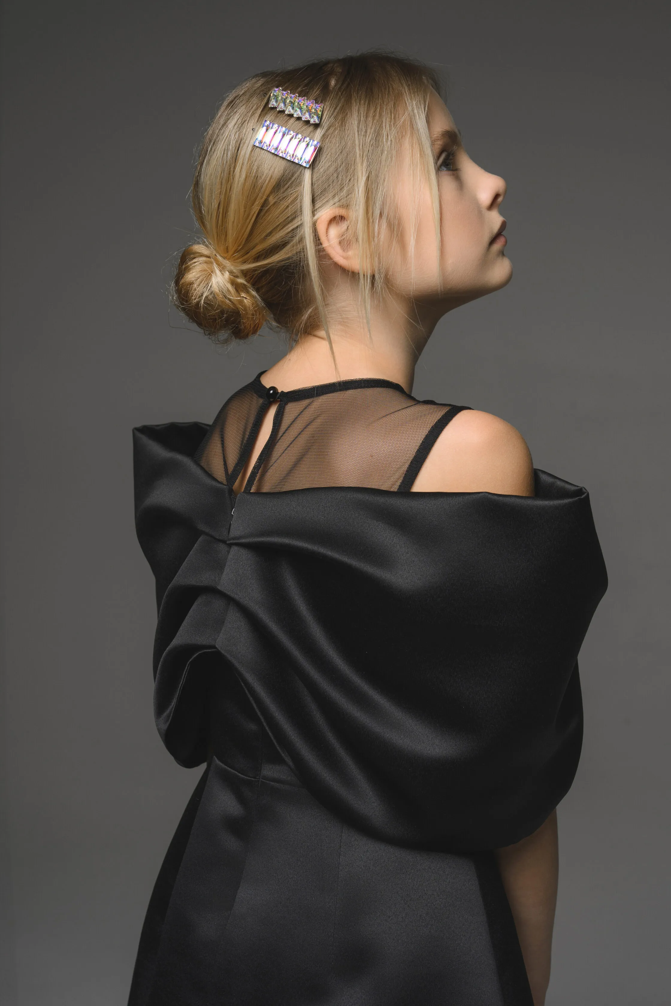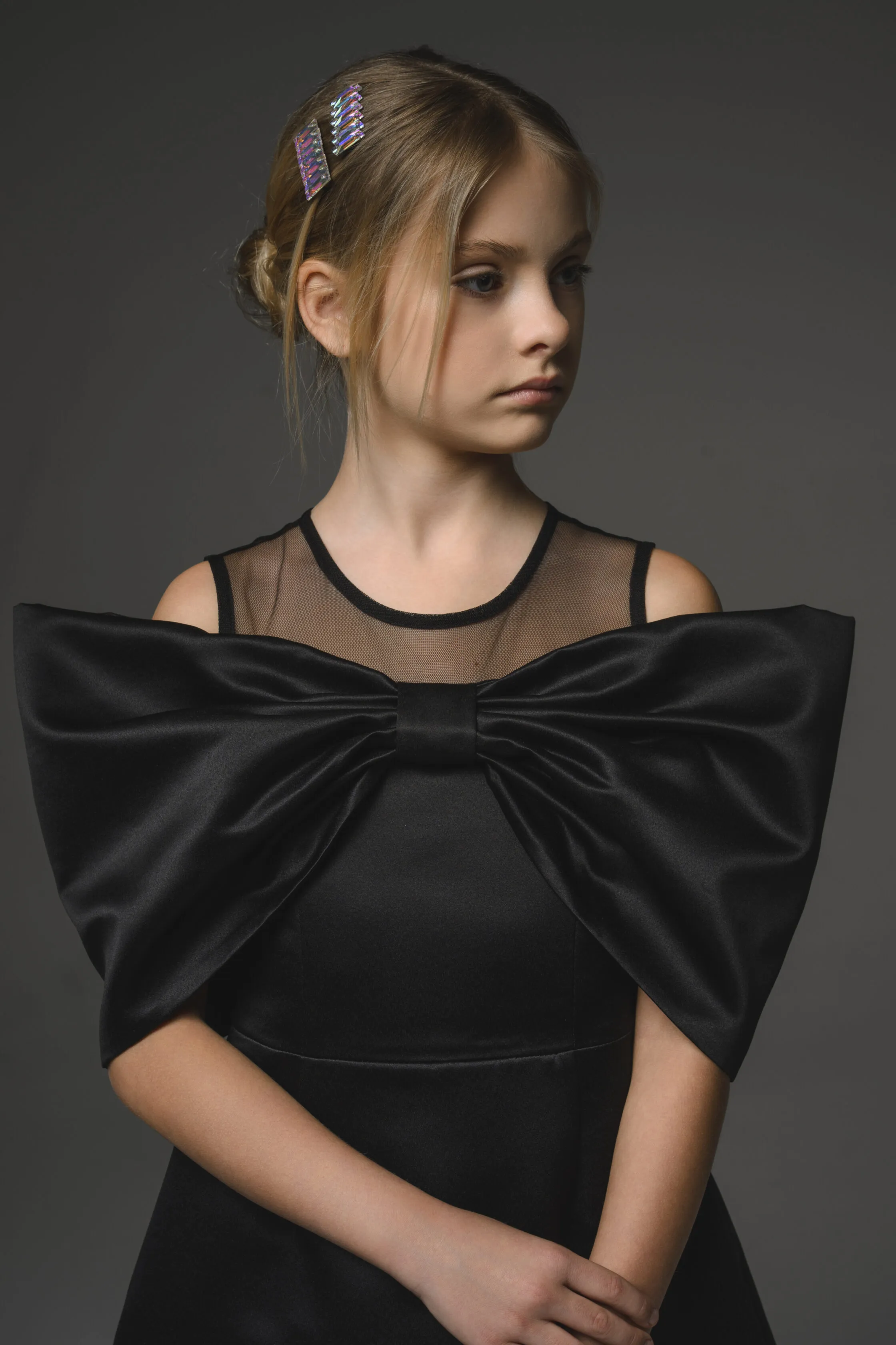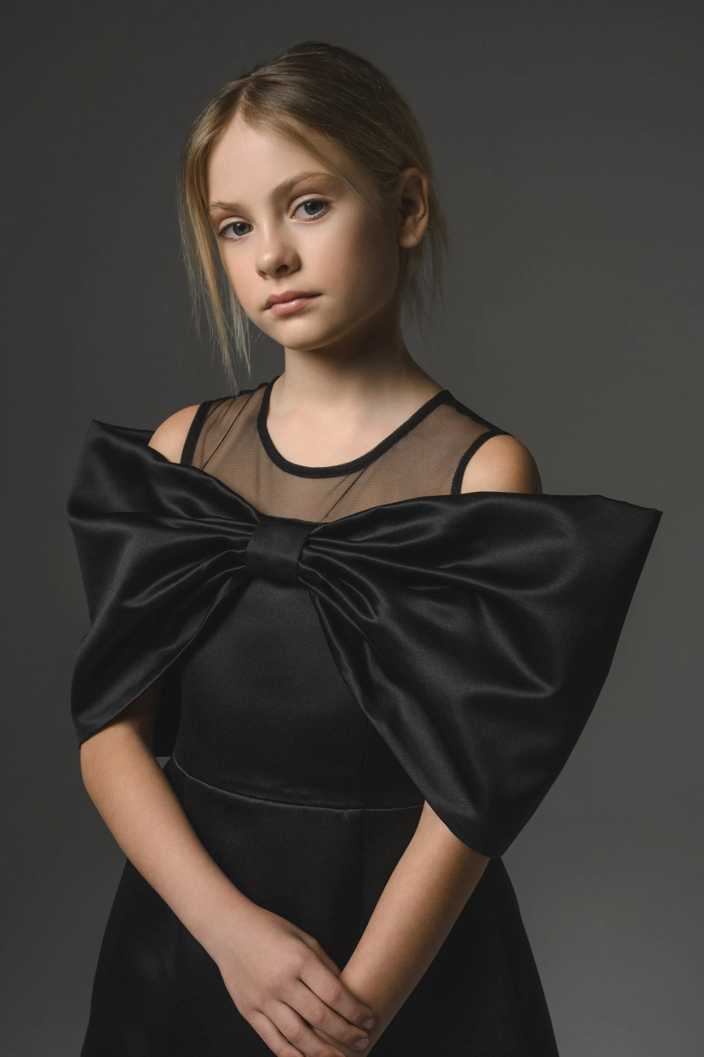Нарядное платье из атласной ткани, прилегающего силуэта, на подкладке. Верхняя часть лифа выполнена из трикотажной сетки. Платье без воротника и рукавов, круглый вырез горловины застегивается на спинке на навесную петлю и пуговицу и потайную молнию. Верх платья оформлен крупным бантом. Юбка в форме колокола. Внизу левого бокового шва пришита отделочная страза прямоугольной формы.