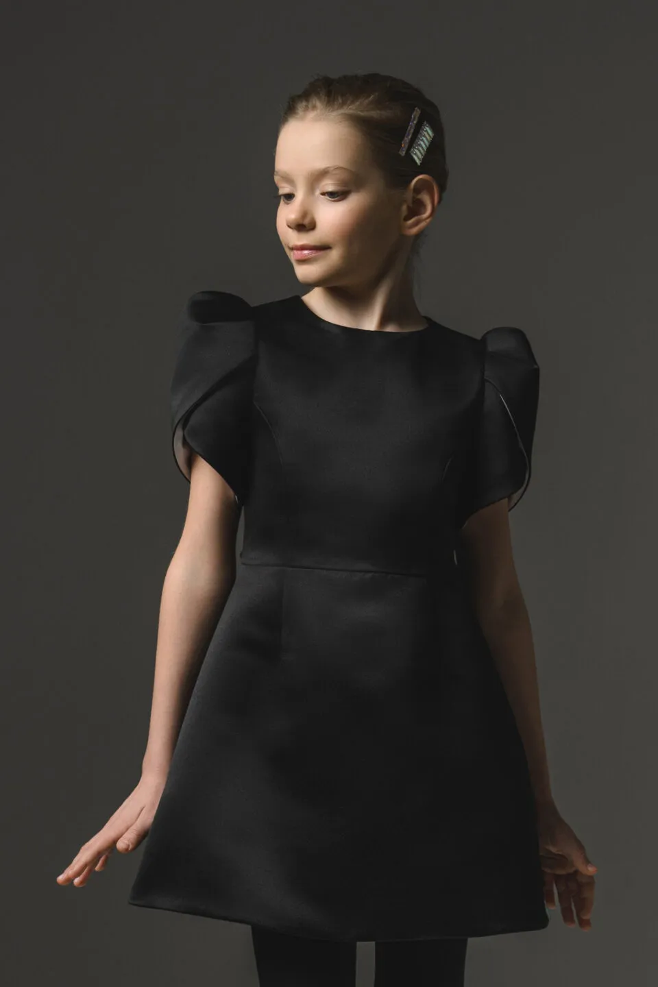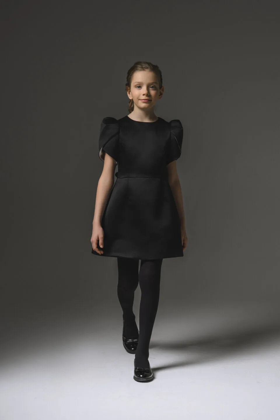 Нарядное платье из атласной ткани, на подкладке, приталенное, без воротника, круглый вырез горловины. Застежка расположена по центру спинки на потайную молнию, вдоль которой пришиты отделочные пуговицы контрастного цвета. Рукава короткие, фигурной формы, объемные в верхней части внутренняя часть рукавов с отделкой контрастной тканью. Юбка в форме колокола. Внизу левого бокового шва пришита отделочная страза прямоугольной формы. Ширина платья по талии регулируется бантом, завязывающимся на спинке.