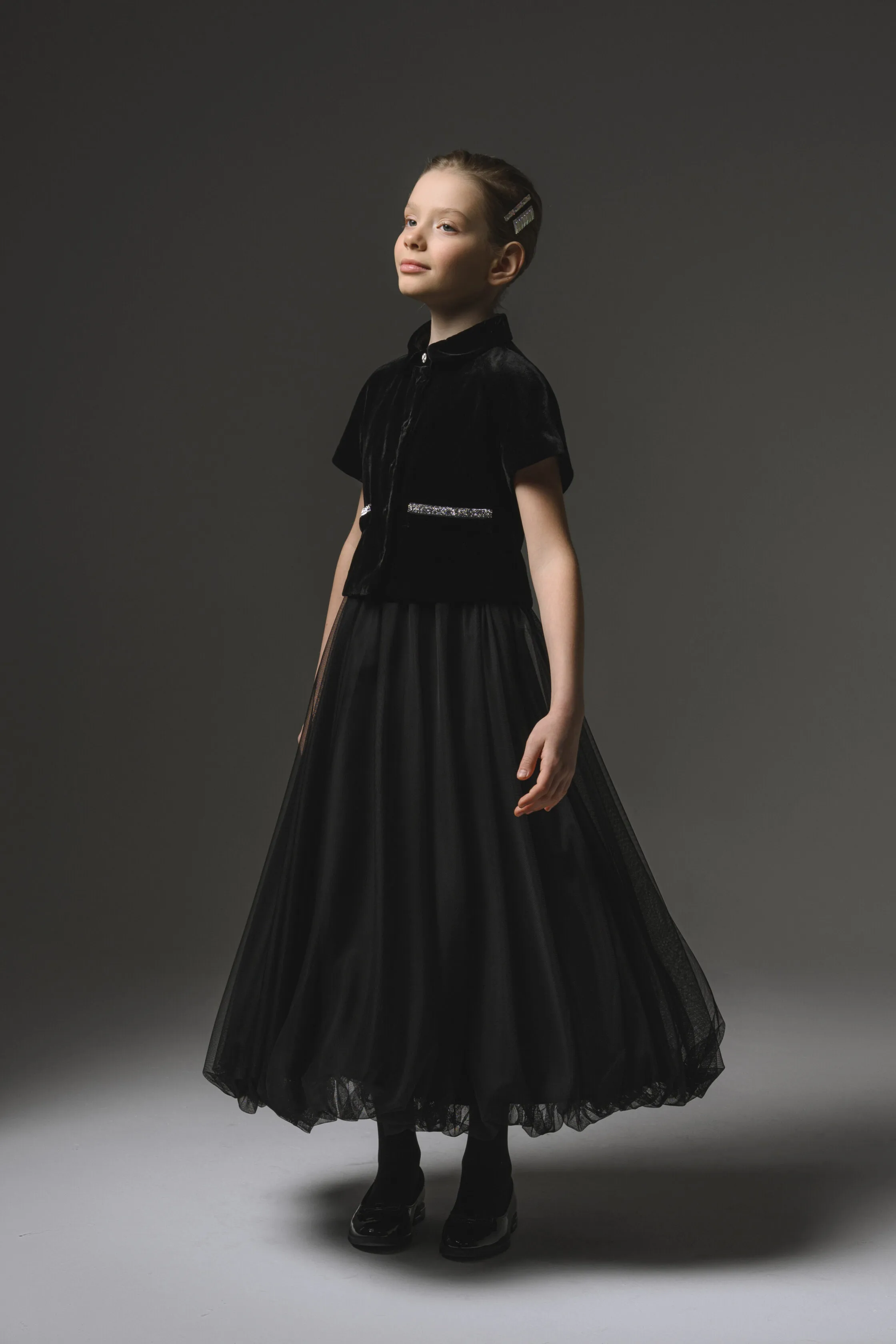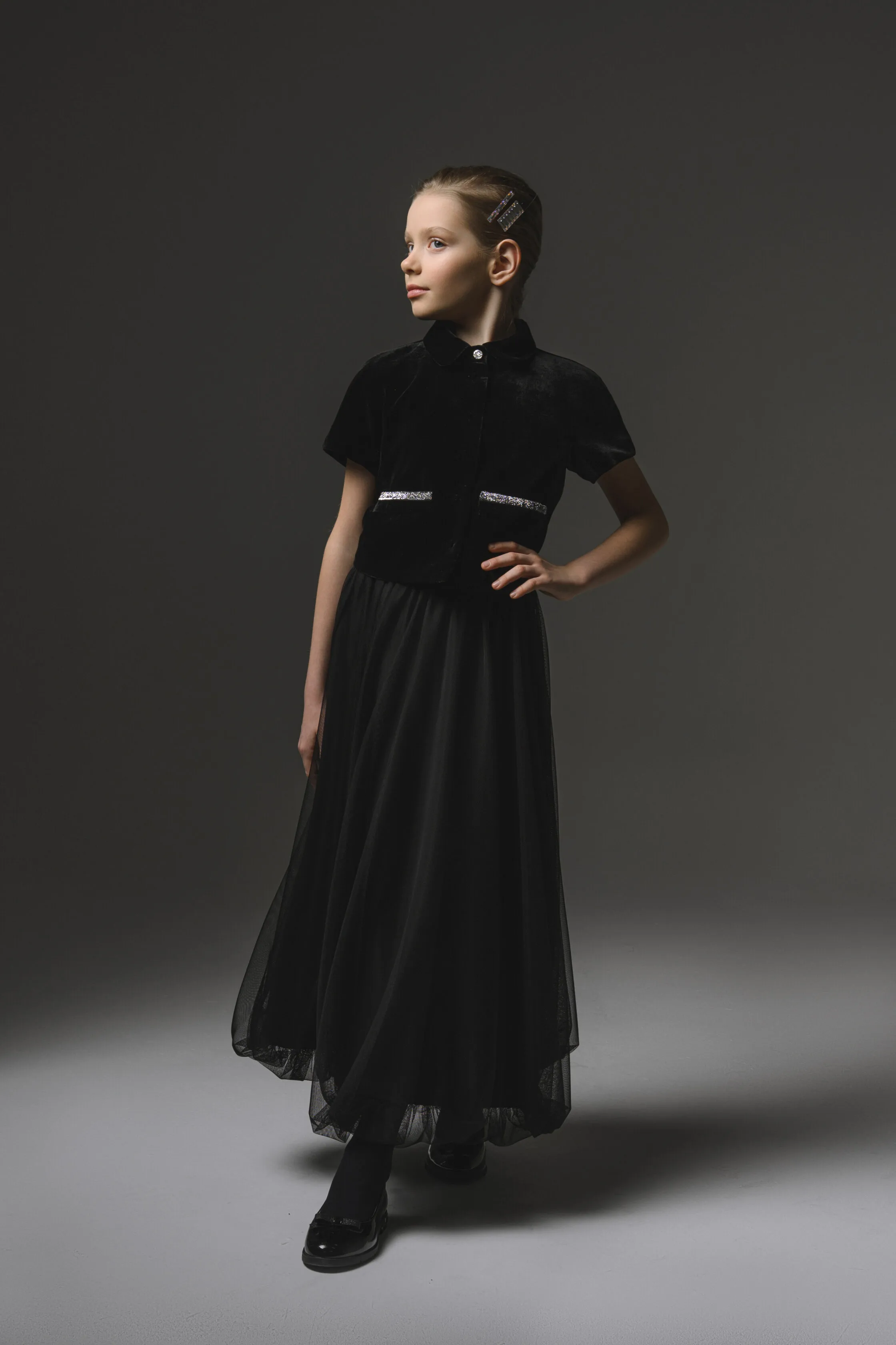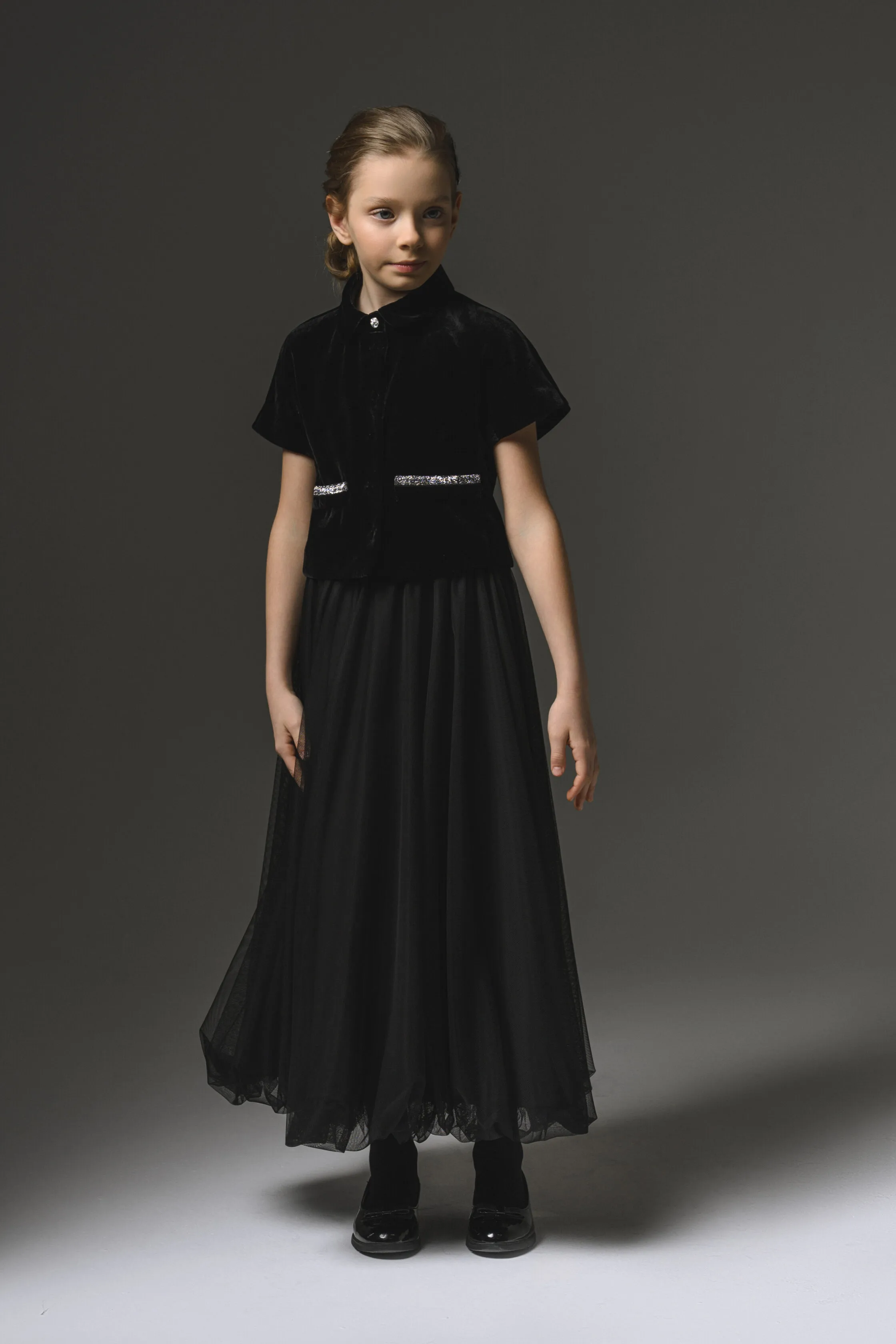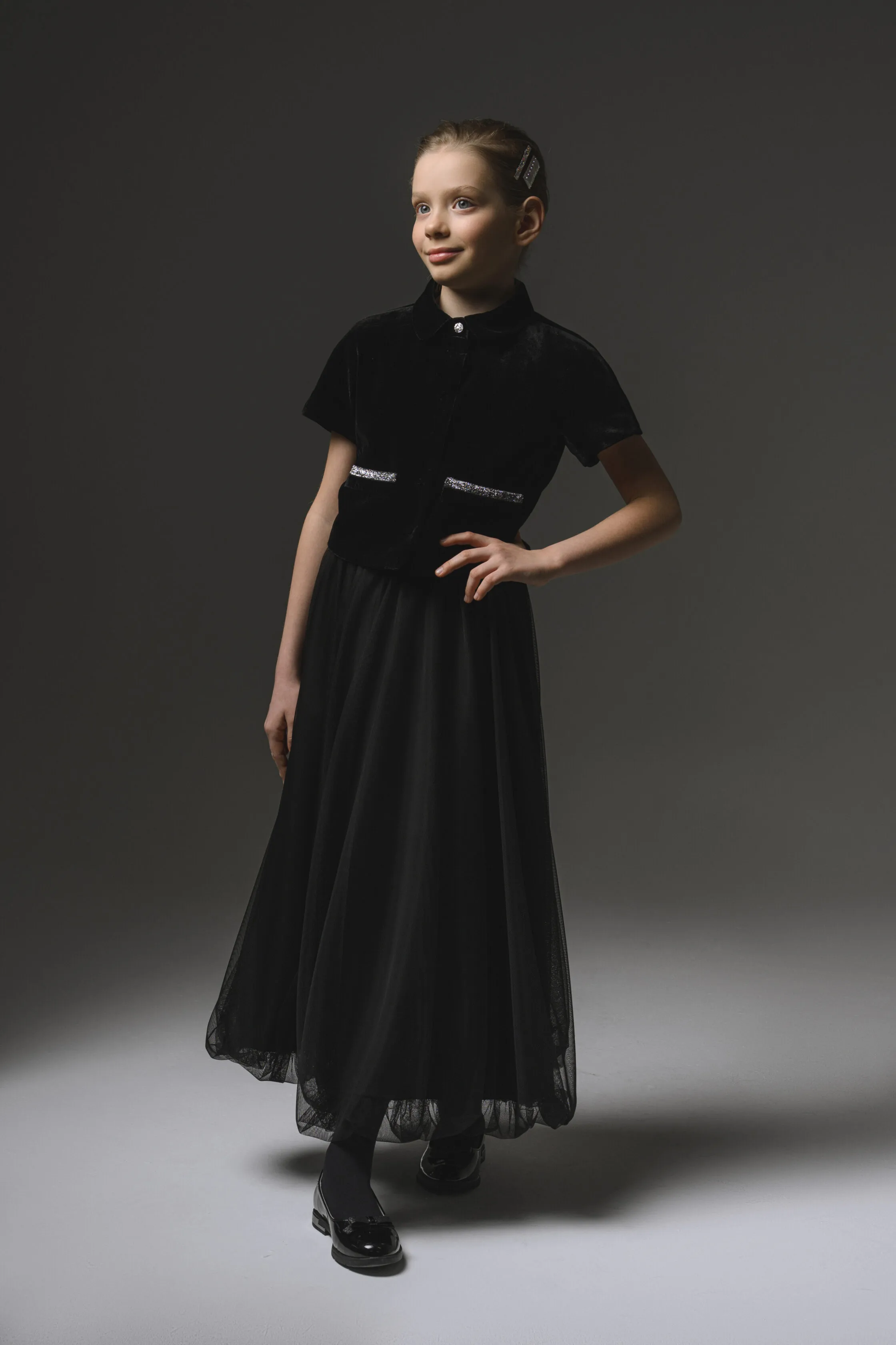 Юбка макси свободного силуэта из костюмной ткани, верхний слой из трикотажной сетки, на подкладке, расклешенная к низу. Потайная застежка-молния расположена в боковом шве. Низ юбки, собранный на сборку, обработан подкладкой и образует форму баллона.