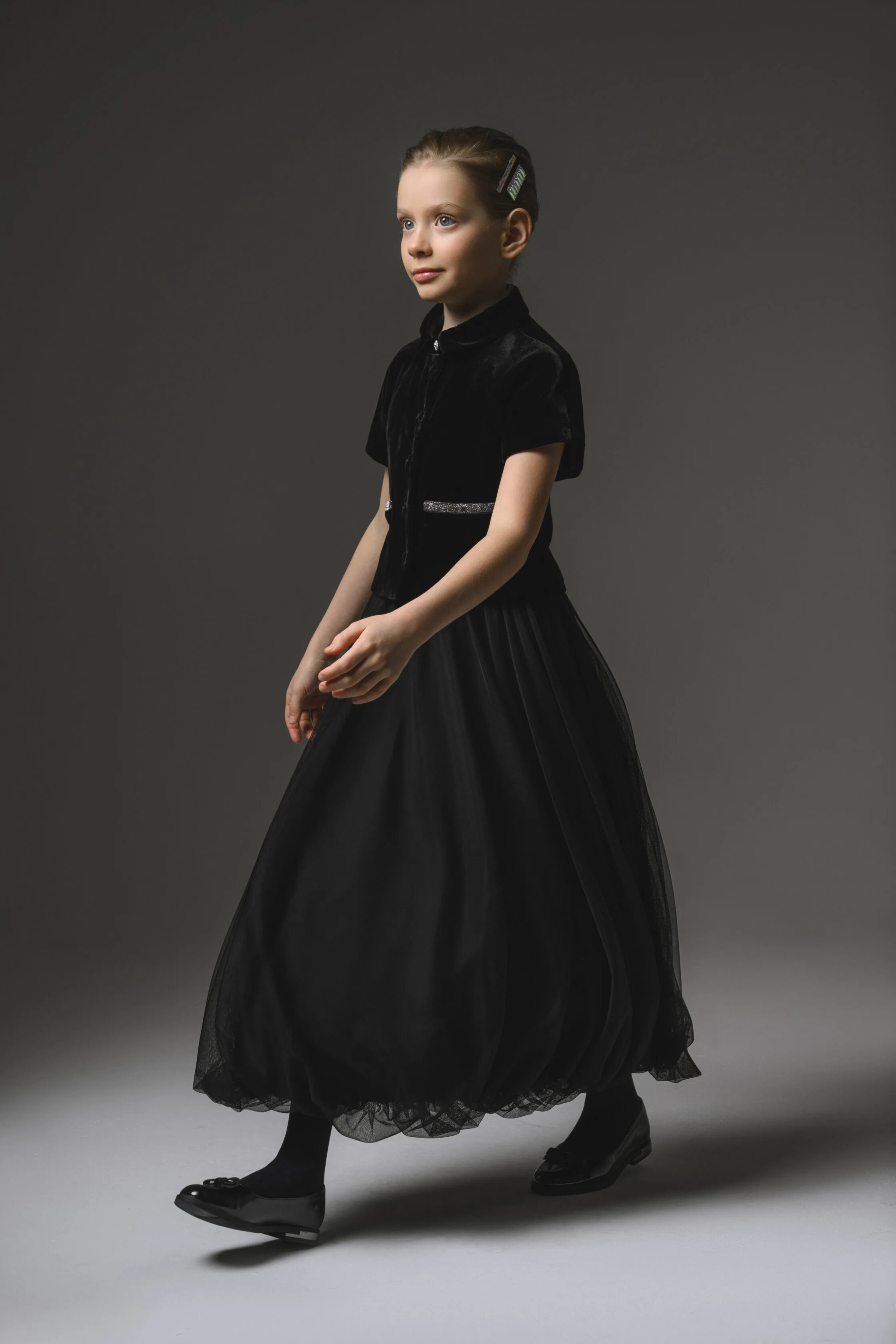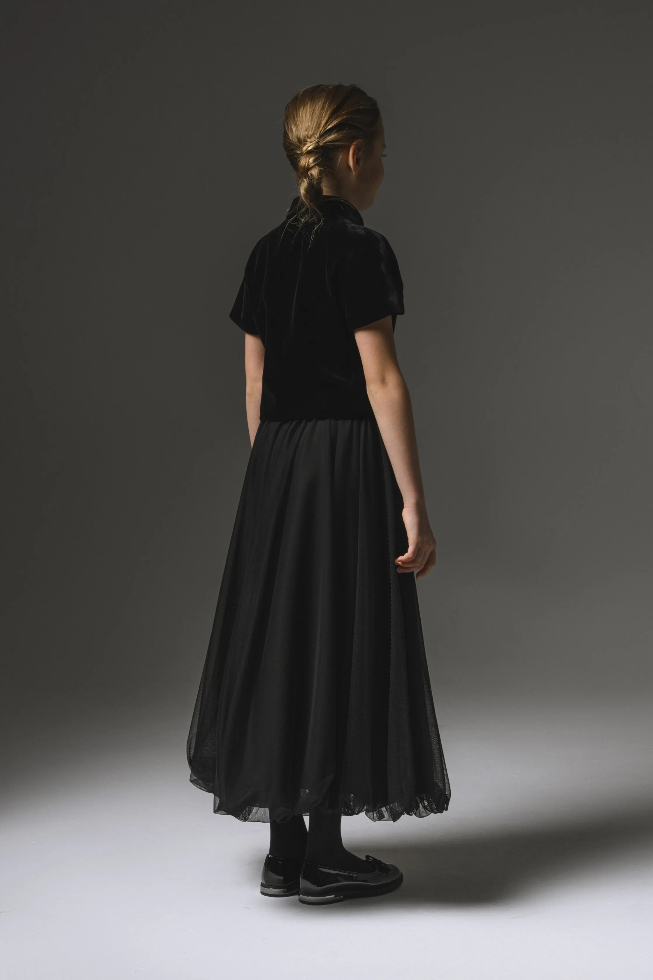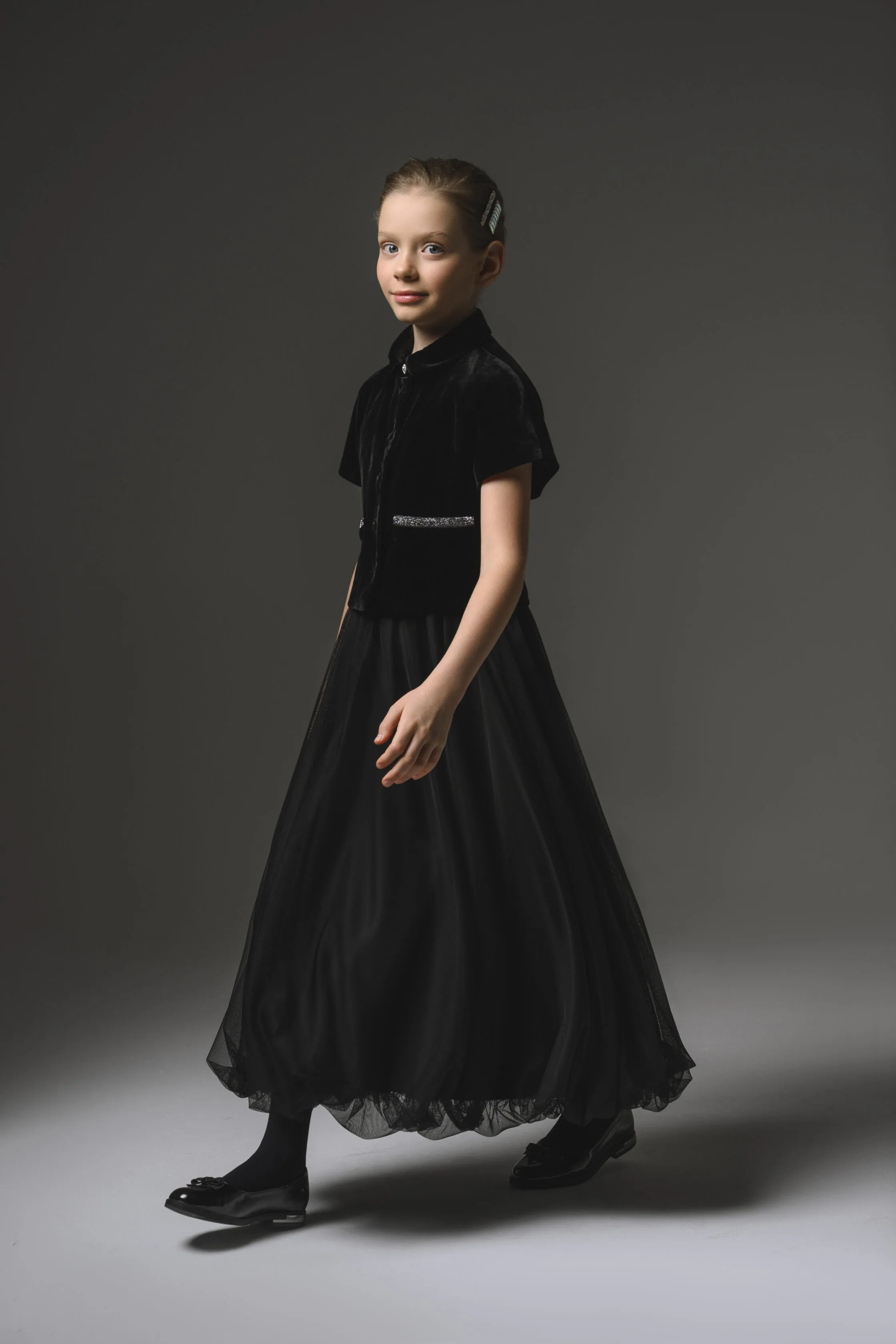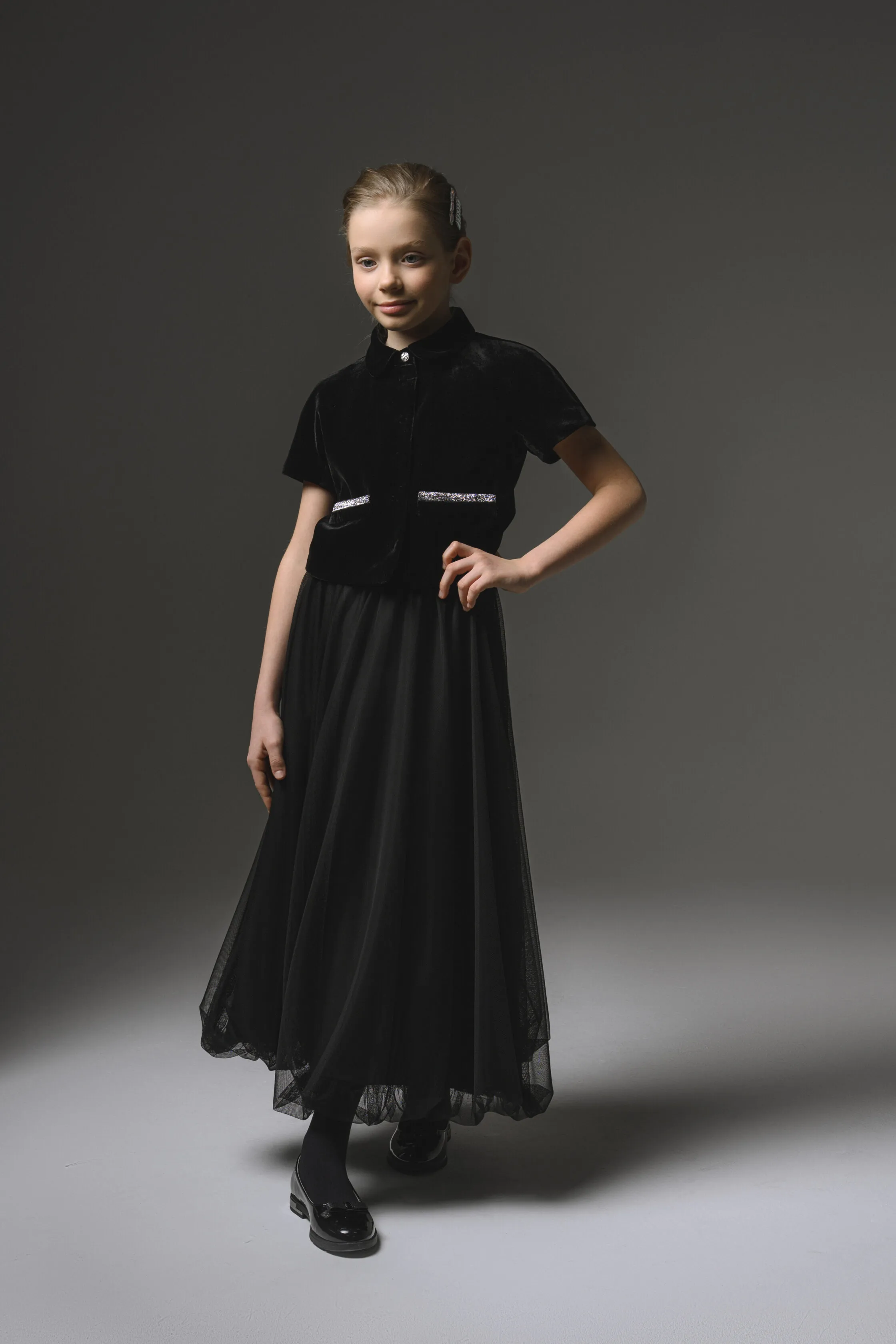 Юбка макси свободного силуэта из костюмной ткани, верхний слой из трикотажной сетки, на подкладке, расклешенная к низу. Потайная застежка-молния расположена в боковом шве. Низ юбки, собранный на сборку, обработан подкладкой и образует форму баллона.