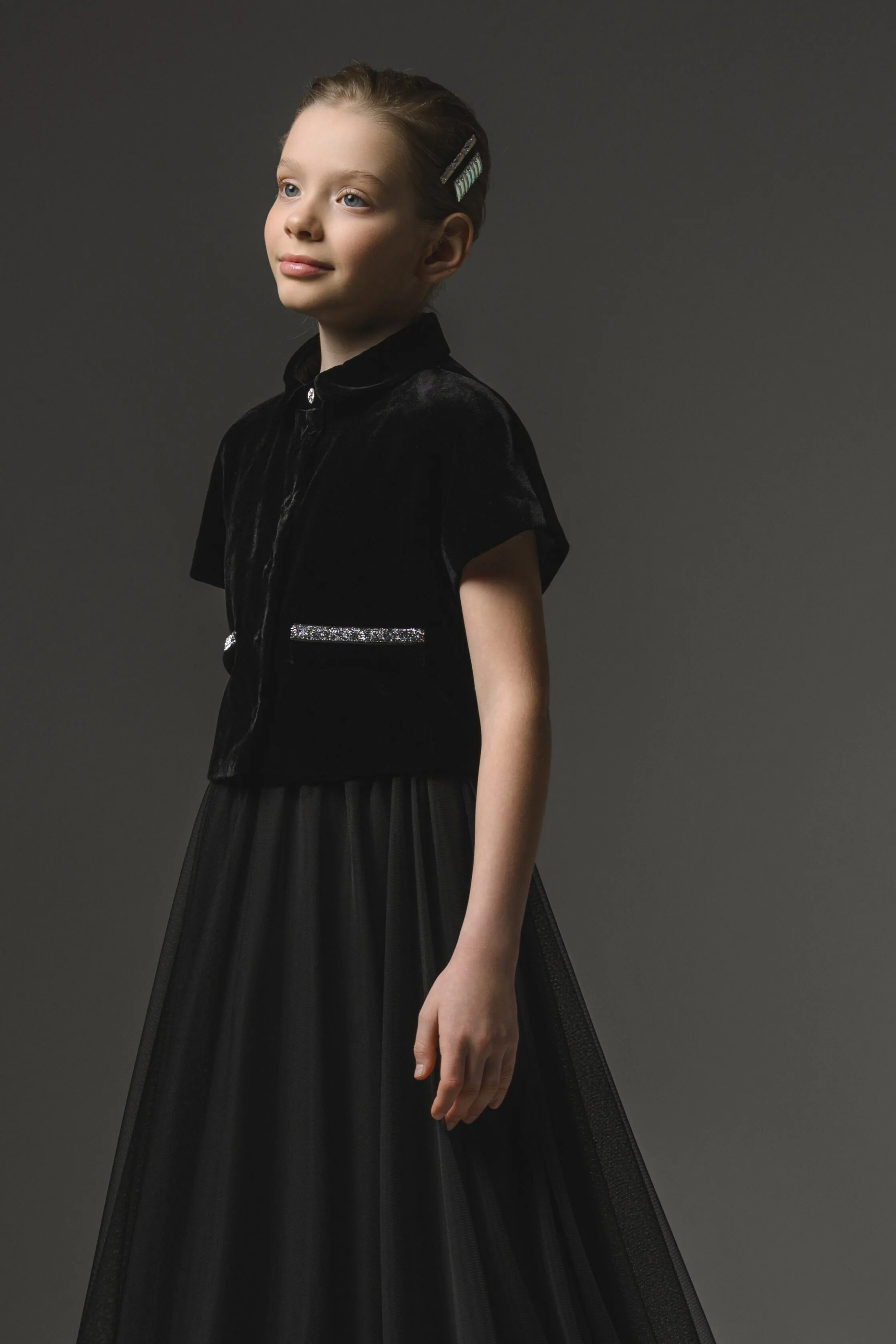 Нарядная блузка прямого силуэта, рукава реглан. Нижняя блузка из натуральной шелковой ткани молочного цвета. Верхняя блузка из черной сетки, перед и рукава с заложенными односторонними складками, создающими объем. Блузка без воротника, застежка «капелька» на навесную петлю и пуговицу расположена в верхней части среднего шва спинки.
